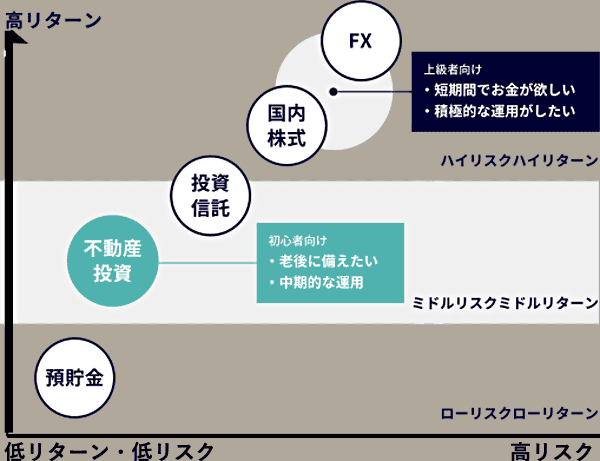 不動産投資は、数ある金融商品の中でも、ミドルリスク・ミドルリターンな投資商品のため、初心者の方におすすめと言われています。